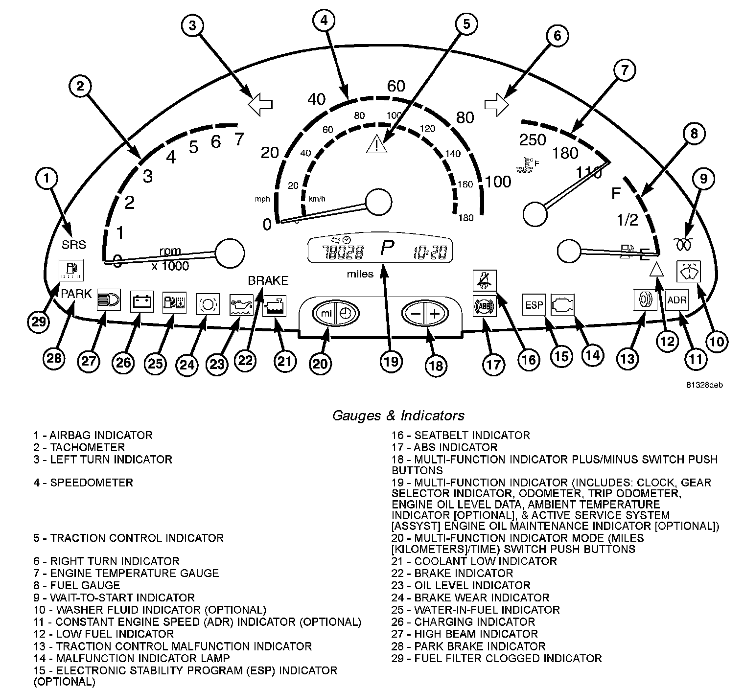 Indicators are located in various positions within the EMIC and are all connected to the EMIC electronic circuit board. The ambient temperature indicator (optional), brake indicator, brake wear indicator, charging indicator, coolant low indicator, high beam indicator, low fuel indicator, park brake indicator, seatbelt indicator, turn signal indicators, and washer fluid indicator operate based upon hard wired inputs to the EMIC. The airbag (SRS) indicator is normally controlled by a hard wired input from the Airbag Control Module (ACM); however, if the EMIC sees an abnormal or no input from the ACM, it will automatically turn the airbag indicator On until the hard wired input from the ACM has been restored. The Malfunction Indicator Lamp (MIL) is normally controlled by CAN data bus messages from the Engine Control Module (ECM); however, if the EMIC loses CAN data bus communication, the EMIC circuitry will automatically turn the MIL on until CAN data bus communication is restored. The EMIC uses CAN data bus messages from the ECM, the ACM, and the Controller Antilock Brake to control all of the remaining indicators.