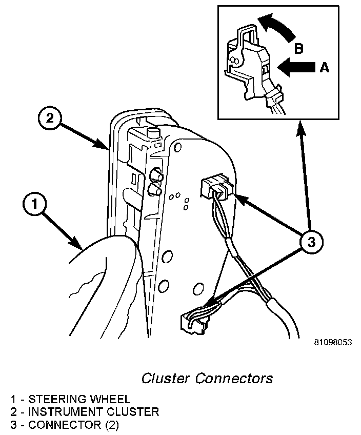 6. Depress the release (Arrow A) and lift the lever arm (Arrow B) to disconnect each of the two frame wire harness connectors for the cluster from the connector receptacles on the back of the cluster housing.