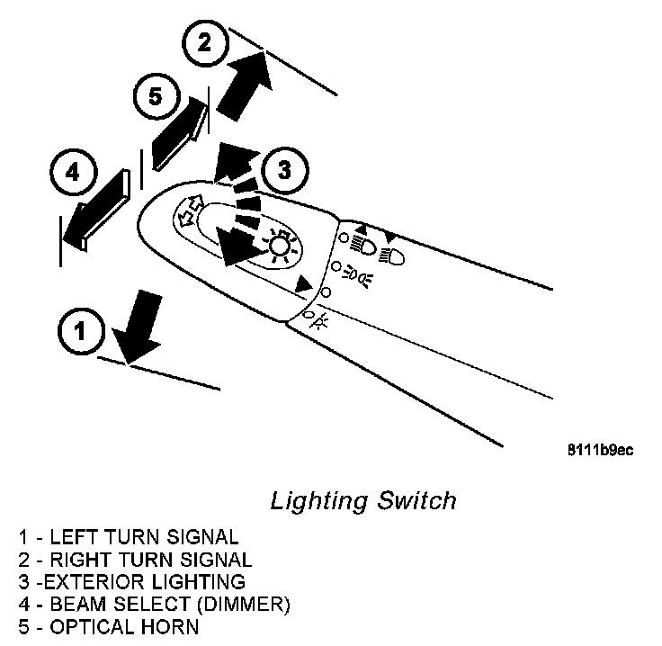- Multi-Function Switch - The multi-function switch is located on the top of the steering column, just below the steering wheel. The multi-function switch is connected directly to the fuse block located below the steering column through an integral interface connector. Only the left (lighting), right (wiper) control stalks and the hazard warning switch button for the multi-function switch are visible, the remainder of the switch is concealed beneath the steering column shrouds. The multi-function switch includes a left (lighting) control stalk and a right (wiper) control stalk. The left control stalk is dedicated to providing almost all of the driver controls for the exterior lighting system.