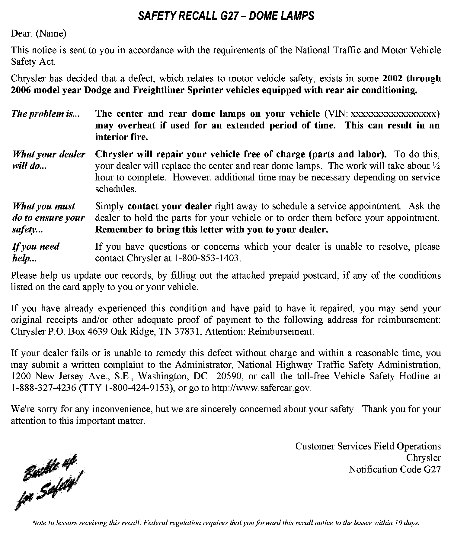 Recall - Dome Lamp Overheating/Fire Potential