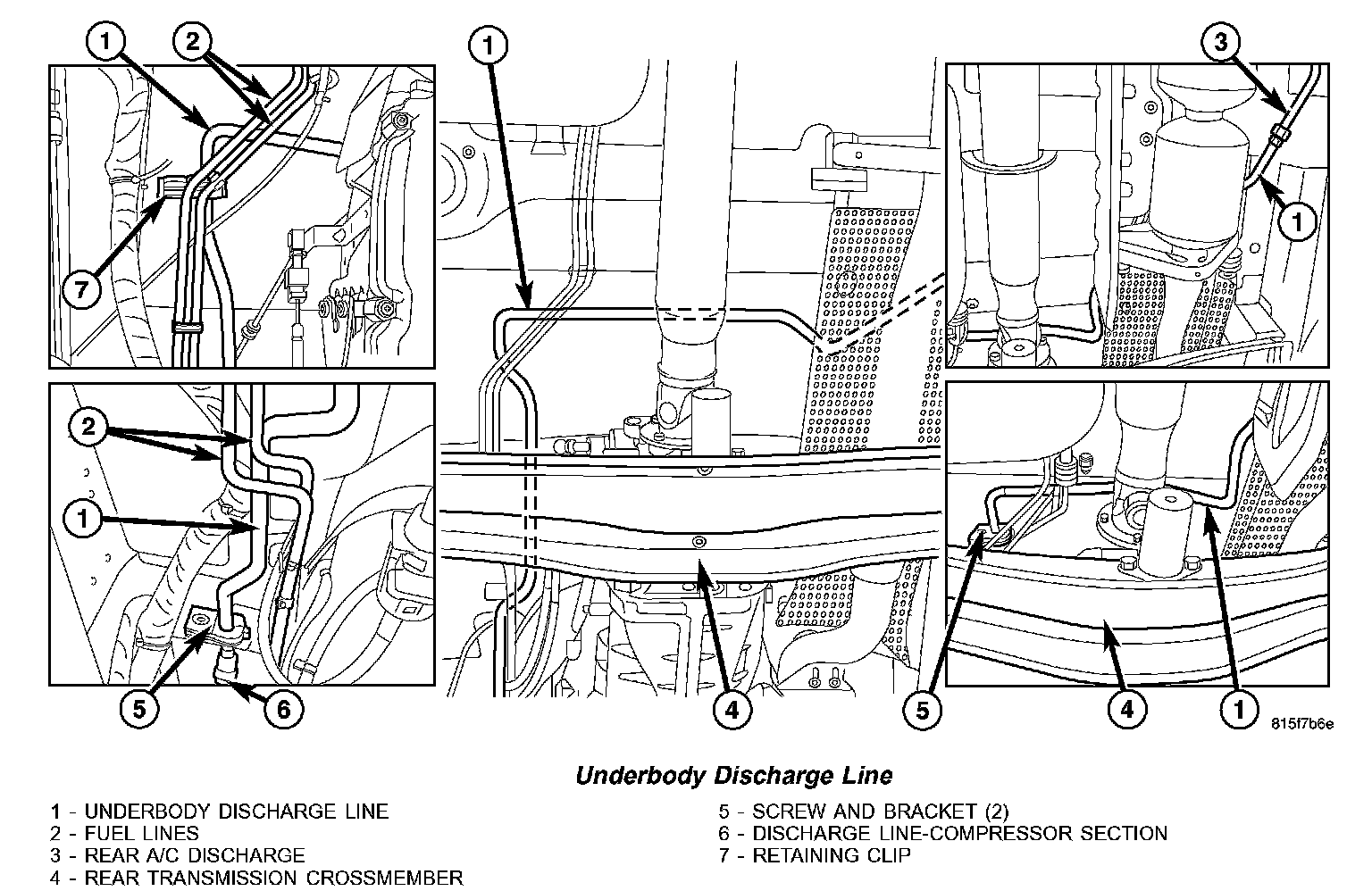 NOTE: The underbody refrigerant lines for the optional rear A/C system are serviced in five sections. Two sections are connected the A/C compressor. Two sections of the underbody suction line (low-side) are connected together by a tapping block with an O-ring seal. The underbody A/C discharge line uses a spring-lock type refrigerant line coupler with an O-ring seal.