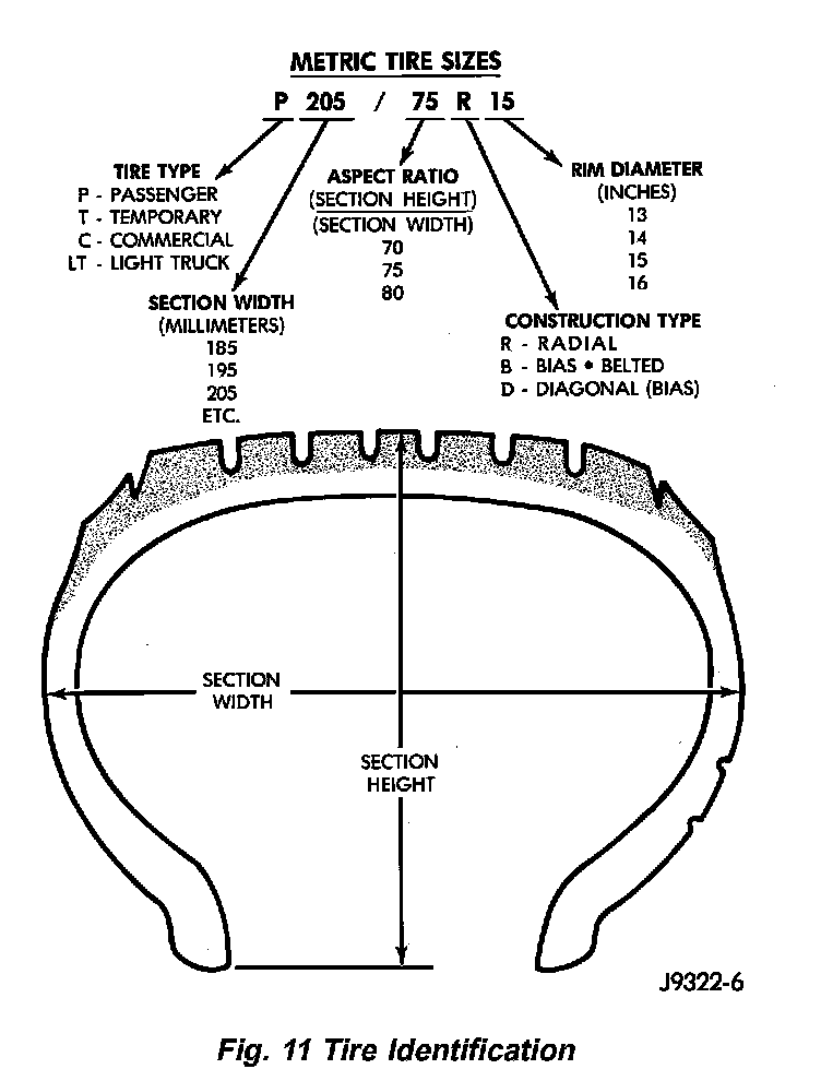 Tire type, size, aspect ratio and speed rating are encoded in the letters and numbers imprinted on the side wall of the tire. Refer to the chart to decipher the tire identification code (Fig. 11).