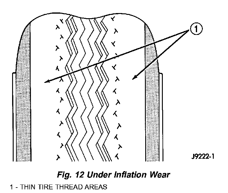 Under inflation will cause rapid shoulder wear, tire flexing, and possible tire failure (Fig. 12).