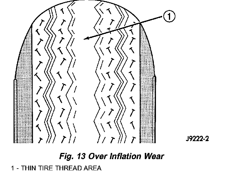 Over inflation will cause rapid center wear and loss of the tire's ability to cushion shocks (Fig. 13).