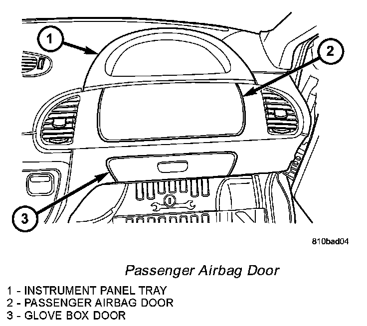 The rearward facing surface of the injection molded, thermoplastic passenger airbag door is the most visible part of the optional passenger airbag. The passenger airbag door is located above the glove box opening in front of the front seat passenger seating position on the instrument panel. The upper and lower edges of the airbag door are secured by a snap-fit to molded plastic clips. The two clips at the top are each secured by a screw to the instrument panel base trim, while the clips at the bottom are integral to the panel that surrounds the passenger airbag door opening in the instrument panel bast trim. The airbag door is also secured to the airbag housing by two wide woven straps that serve as hinges for the door upon an airbag deployment.