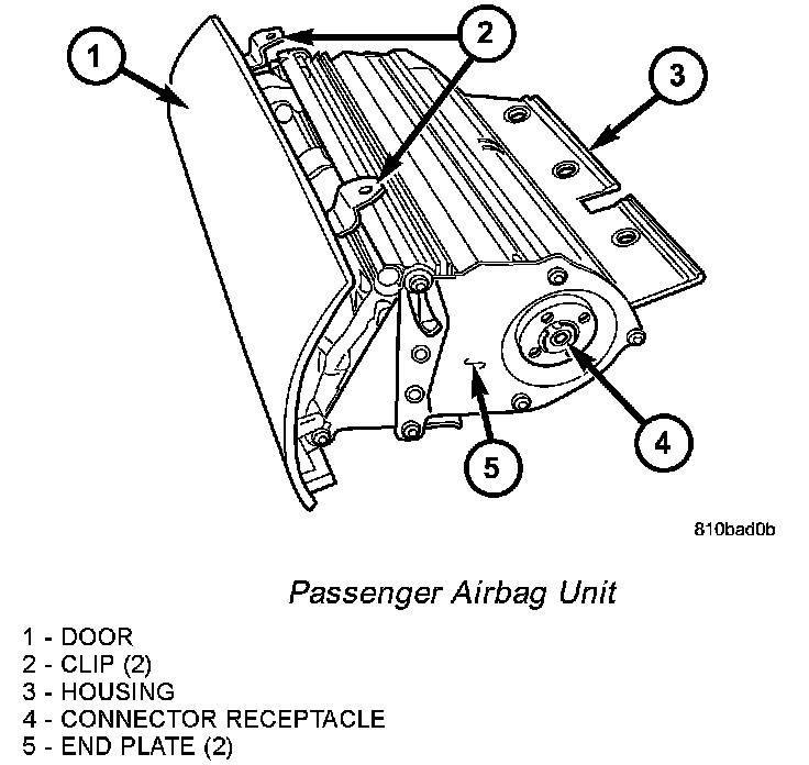 Located behind the passenger airbag door is the passenger airbag unit. The airbag housing is constructed of a long U-shaped aluminum extrusion with two stamped steel end plates. A stepped flange that extends from the back of the extrusion serves as the airbag mounting flange. This mounting flange is secured with screws to a stamped steel air-bag mounting bracket that is secured with screws to the tubular steel instrument panel structural support above the glove box opening. The end plates are secured to each side of the passenger airbag housing with screws.