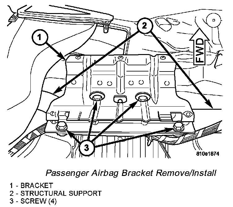 2. Remove the four screws that secure the passenger airbag bracket to the instrument panel structural support.