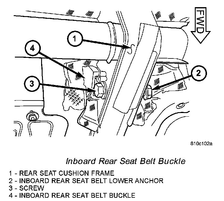 3. Remove the screw that secures either the inboard rear seat belt buckle to the rear seat cushion frame.