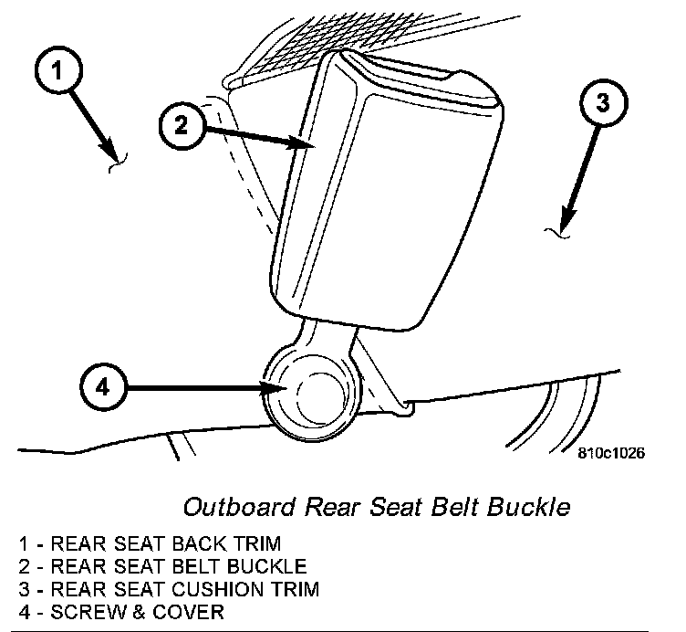 1. Unsnap and remove the plastic cover from the screw that secures the outboard rear seat belt buckle to the right side of the seat cushion frame.