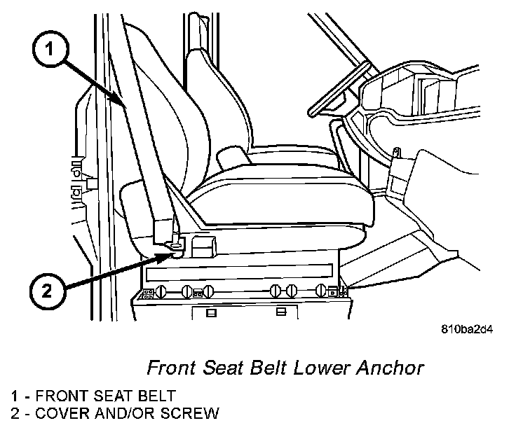 3. If the vehicle is so equipped, unsnap and remove the plastic cover from the screw that secures the front seat belt lower anchor to the outboard side of the seat frame.