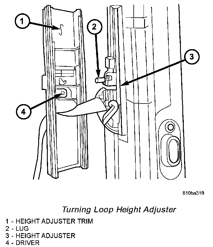 7. Position the height adjuster trim to the upper B-pillar so that the driver on the back of the trim engages the lug of the height adjuster.