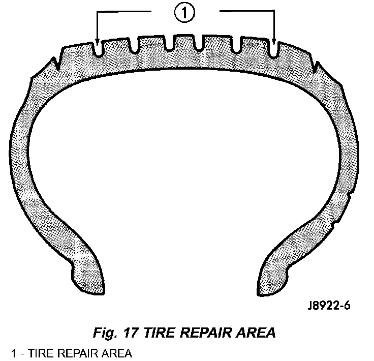 STANDARD PROCEDURE - REPAIRING LEAKSFor proper repairing, a radial tire must be removed from the wheel. Repairs should only be made if the defect, or puncture, is in the tread area (Fig. 17). The tire should be replaced if the puncture is located in the sidewall.