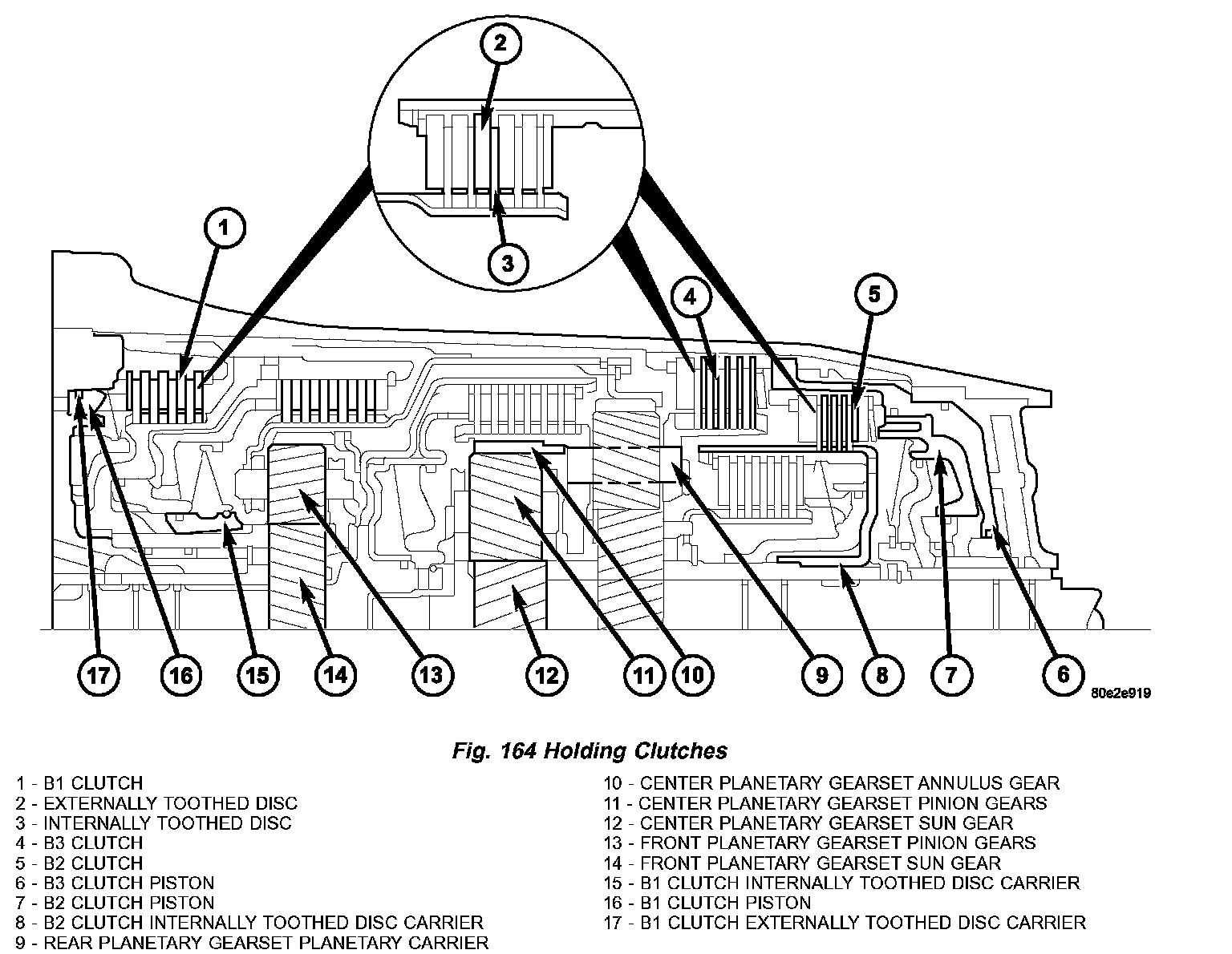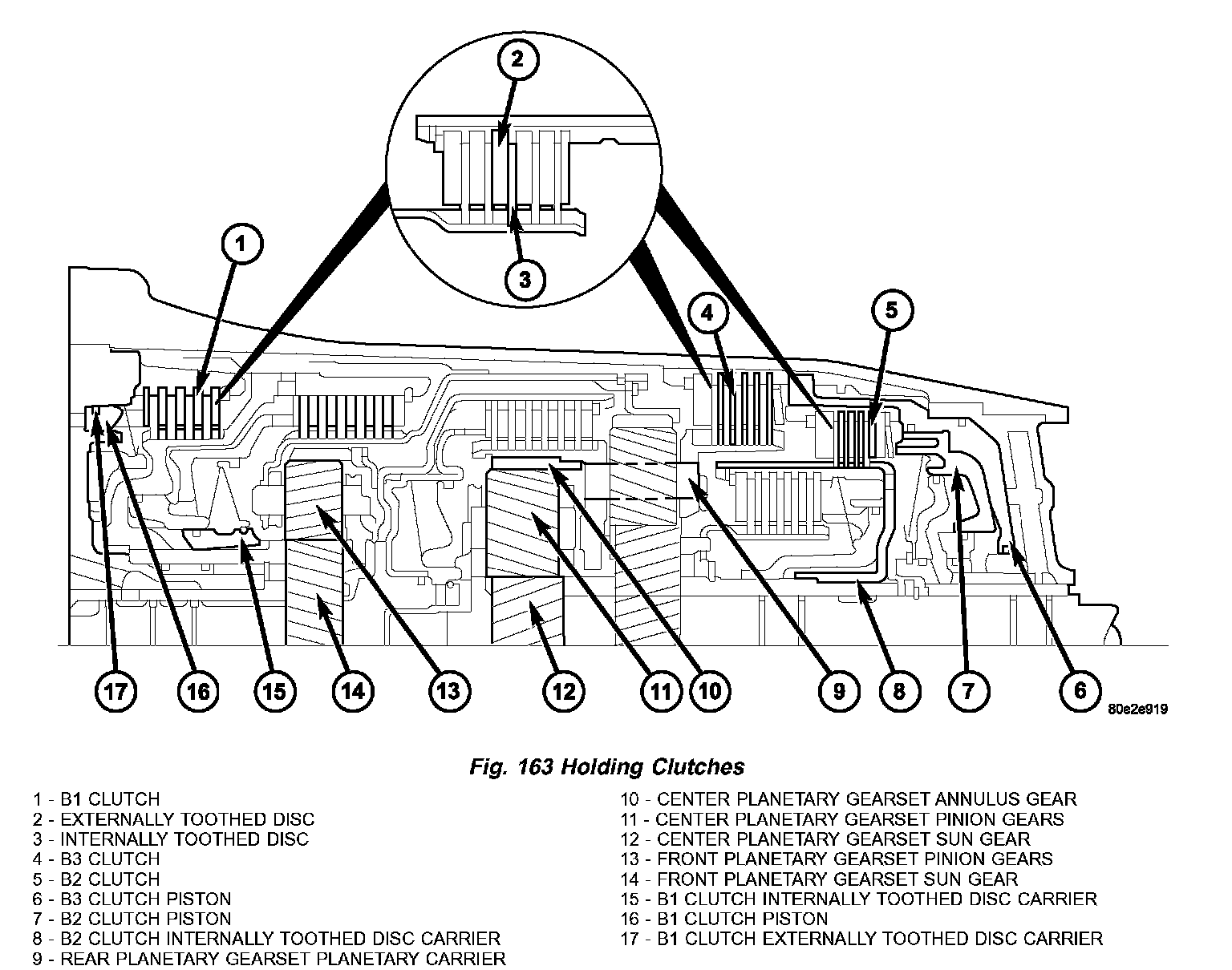 Three (Fig. 163) multiple disc holding clutches, the front, B1 (1), middle, B3 (4), and rear multiple disc clutches, B2 (5), are located in the planetary gear sets in the transmission housing.