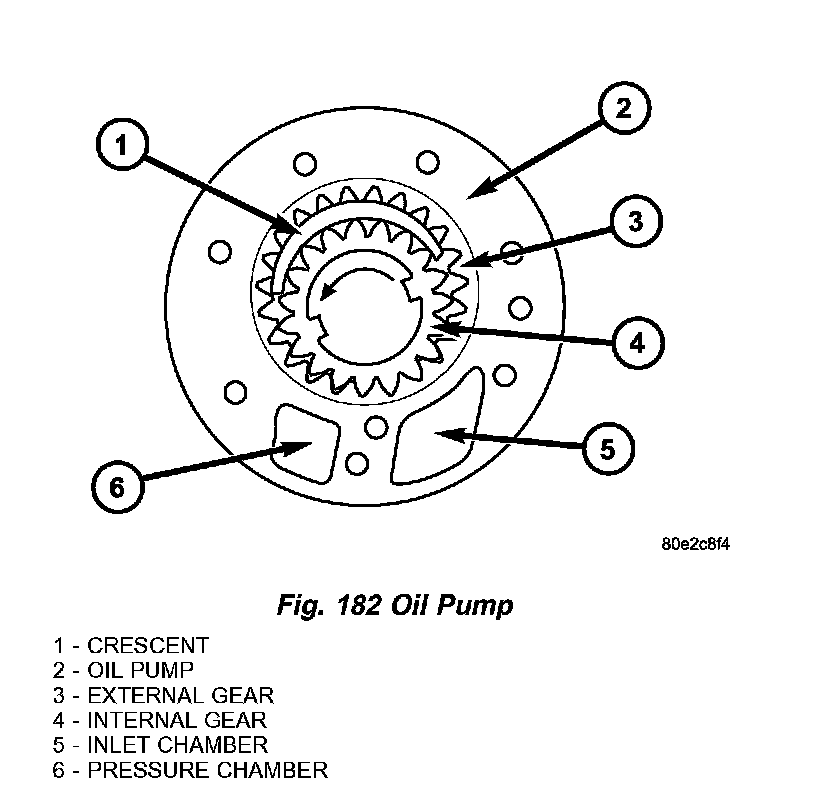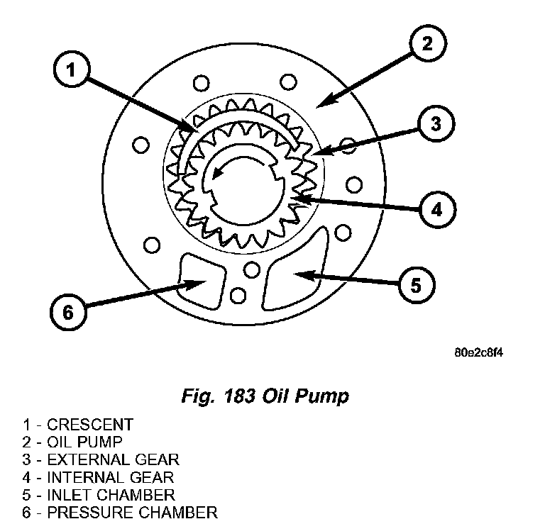 When the engine is running, the oil (Fig. 183) is pumped through the inlet chamber (5) along the upper and lower side of the crescent (1) to the pressure chamber (6) of the housing. The meshing of the teeth prevents oil flowing from the delivery side to the intake side. An external gear (3) is eccentrically mounted in the pump housing. The external gear is driven by the internal gear (4) which is connected to the torque converter hub.