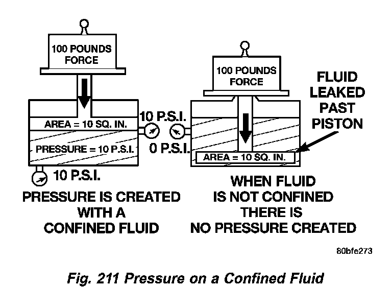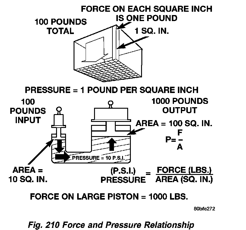 Pressure (Fig. 210) is nothing more than force (lbs.) divided by area (inch or ft.), or force per unit area. Given a 100 lbs. block and an area of 100 sq. inch on the floor, the pressure exerted by the block is: 100 lbs. 100 inch or 1 pound per square inch, or PSI as it is commonly referred to.