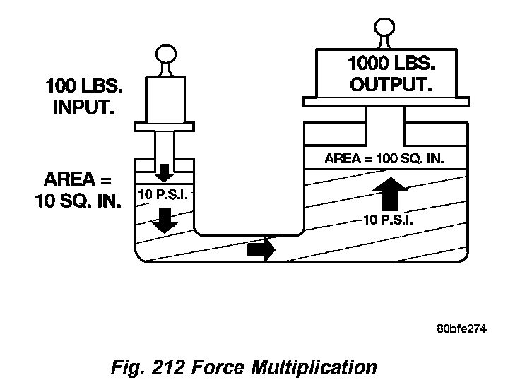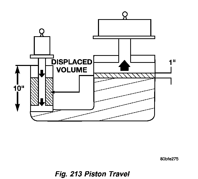 The relationship between hydraulic lever and a mechanical lever is the same. With a mechanical lever it�s a weight to distance output rather than a pressure to area output. Using the same forces and areas as in the previous example, the smaller piston (Fig. 213) has to move ten times the distance required to move the larger piston one inch. Therefore, for every inch the larger piston moves, the smaller piston moves ten inches. This principle is true in other instances also. A common garage floor jack is a good example. To raise a car weighing 2000 lbs., an effort of only 100 lbs. may be required. For every inch the car moves upward, the input piston at the lack handle must move 20 inches downward.