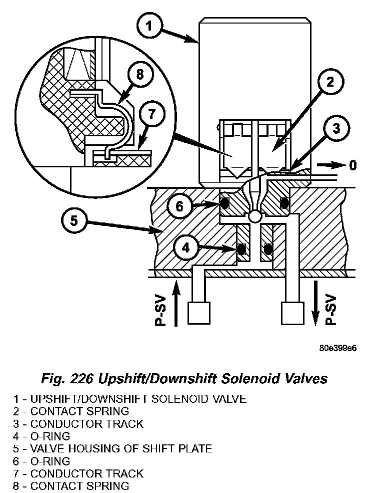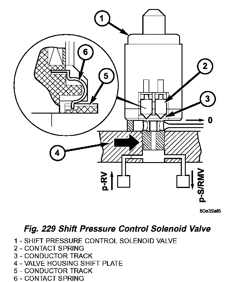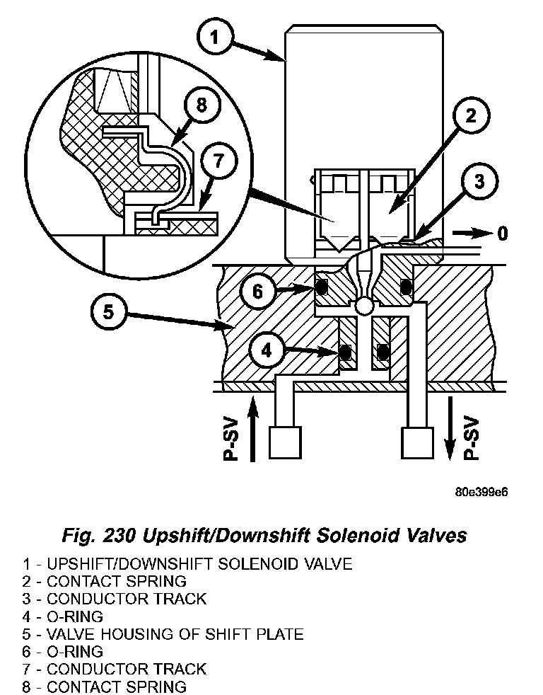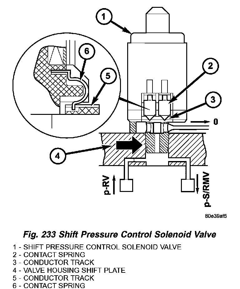 If a solenoid valve (1) (Fig. 230) is actuated by the TCM, it opens and guides the control pressure (p-SV) to the assigned command valve. The solenoid valve remains actuated and therefore open until the shifting process is complete. The shift pressure (p SV) to the command valve is reduced to zero as soon as the power supply to the solenoid valve is interrupted.