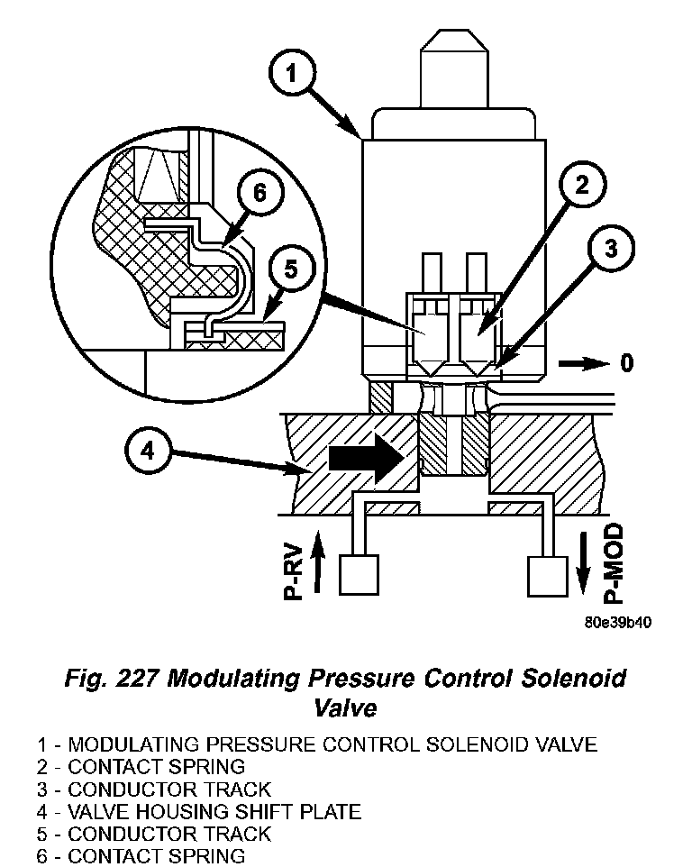 The modulating pressure control solenoid valve (1) (Fig. 227) is located in the shell of the electric valve control unit and pressed against the shift plate by a spring.