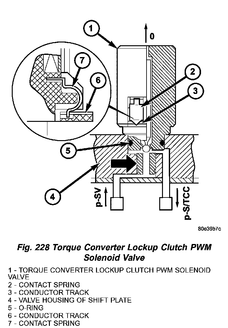 The torque converter lockup PWM solenoid (1) (Fig. 232) valve converts pulse wave modulated current controlled by the TCM into the appropriate hydraulic control pressure (p-S/TCC).
