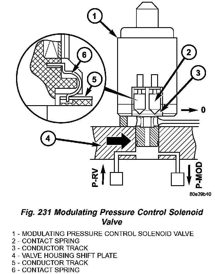 The modulating pressure regulating solenoid valve (1) (Fig. 231) assigns a proportional pressure to the current which is controlled by the TCM according to the load.