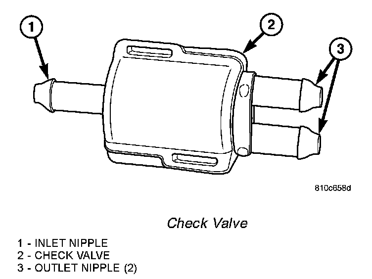 A single washer system check valve is standard equipment on this model, and is installed in the washer system plumbing. The check valve is integral to the washer plumbing fitting located on the underside of the cowl top panel behind the rear of the hood panel opening in the engine compartment. The check valve consists of a molded plastic body with three barbed hose nipples, one at the inlet side of the valve body and two at the outlet side. The check valve cannot be adjusted or repaired and, if faulty or damaged, it must be replaced.
