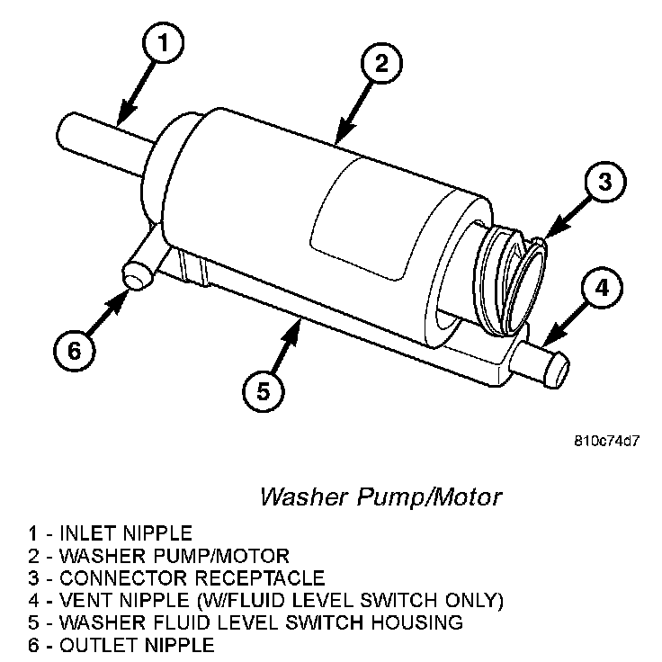 The washer pump/motor unit is connected to the vehicle electrical system through a single take out and connector of the vehicle wire harness. The washer pump/motor is grounded at all times through a take out of the vehicle wire harness with a single eyelet terminal connector that is secured under a ground screw located near the right headlamp in the engine compartment. The washer pump/motor receives battery current on a washer switch sense circuit through the closed contacts of the momentary washer switch circuitry within the multi-function switch. When the pump motor is energized, the rotor-type pump pressurizes the washer fluid and forces it through the pump outlet nipple, the washer plumbing, and the washer nozzles onto the windshield glass. The washer pump/motor unit can be diagnosed using conventional diagnostic tools and methods.