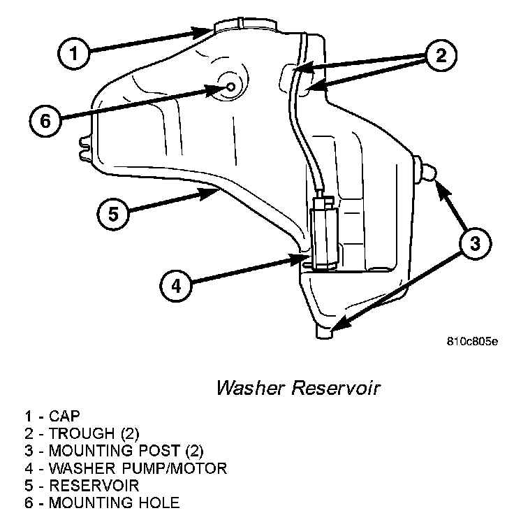 A molded blue plastic filler cap with an integral retainer ring and tether strap snaps over the open end of the filler neck, and hangs from the tether when it is removed for inspecting or adjusting the fluid level in the reservoir. There is a sump area near the bottom inboard side of the reservoir with a dedicated hole provided for the mounting of the washer/ pump motor unit and rubber grommet seal.