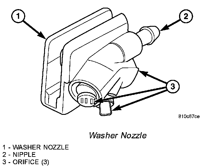 The two washer nozzles have integral mounts with snap features that secure them near the tops of the two wiper arms on the windshield. The lower surface of the washer nozzle has an integral barbed nipple that connects to the washer hose, and three nozzle orifices are oriented to dispense the washer fluid on the windshield glass throughout the wiped area of the glass. The washer nozzles are constructed entirely of molded plastic. The washer nozzles cannot be adjusted or repaired and, if faulty or damaged, they must be replaced.