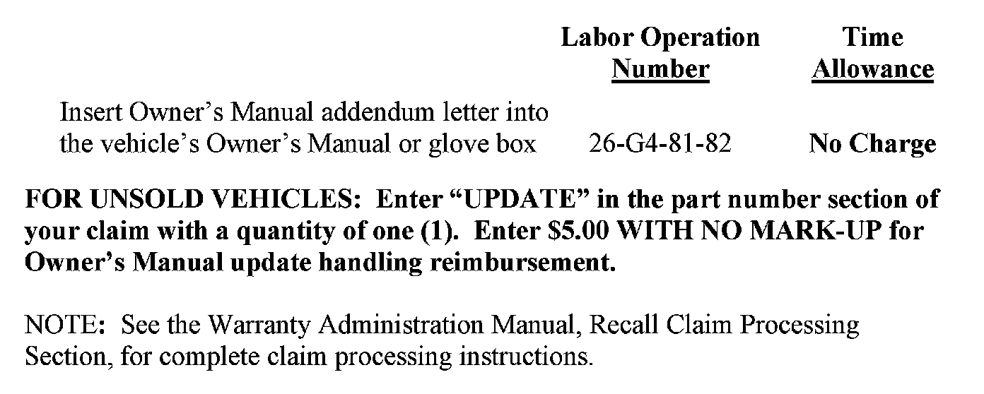 For vehicles in your dealer's new and used vehicle inventory, a copy of the Owner's Manual addendum letter must be placed in the vehicle's Owner's Manual or glove box.