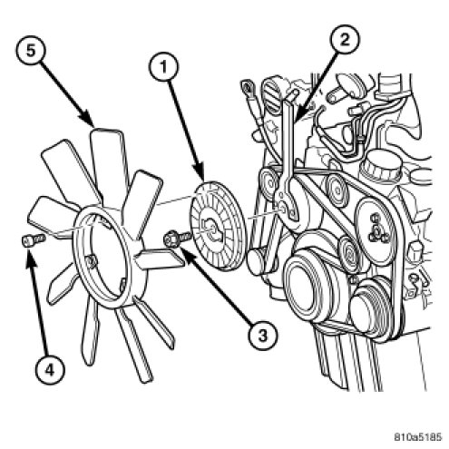 3. Using Counterholder 8930 (Item 2) to hold pulley, remove radiator fan. (Item 5)
