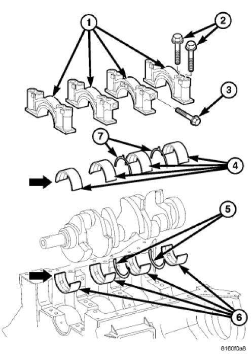 The bottom of the cylinder block has provisions for mounting the main bearing caps and the oil jets. Four main bearing caps (1) made of gray cast iron are bolted to the cylinder block. Each main bearing cap has six mounting bolts, four vertical and two horizontal. The horizontal (cross) bolts add increased rigidity to the cylinder block.