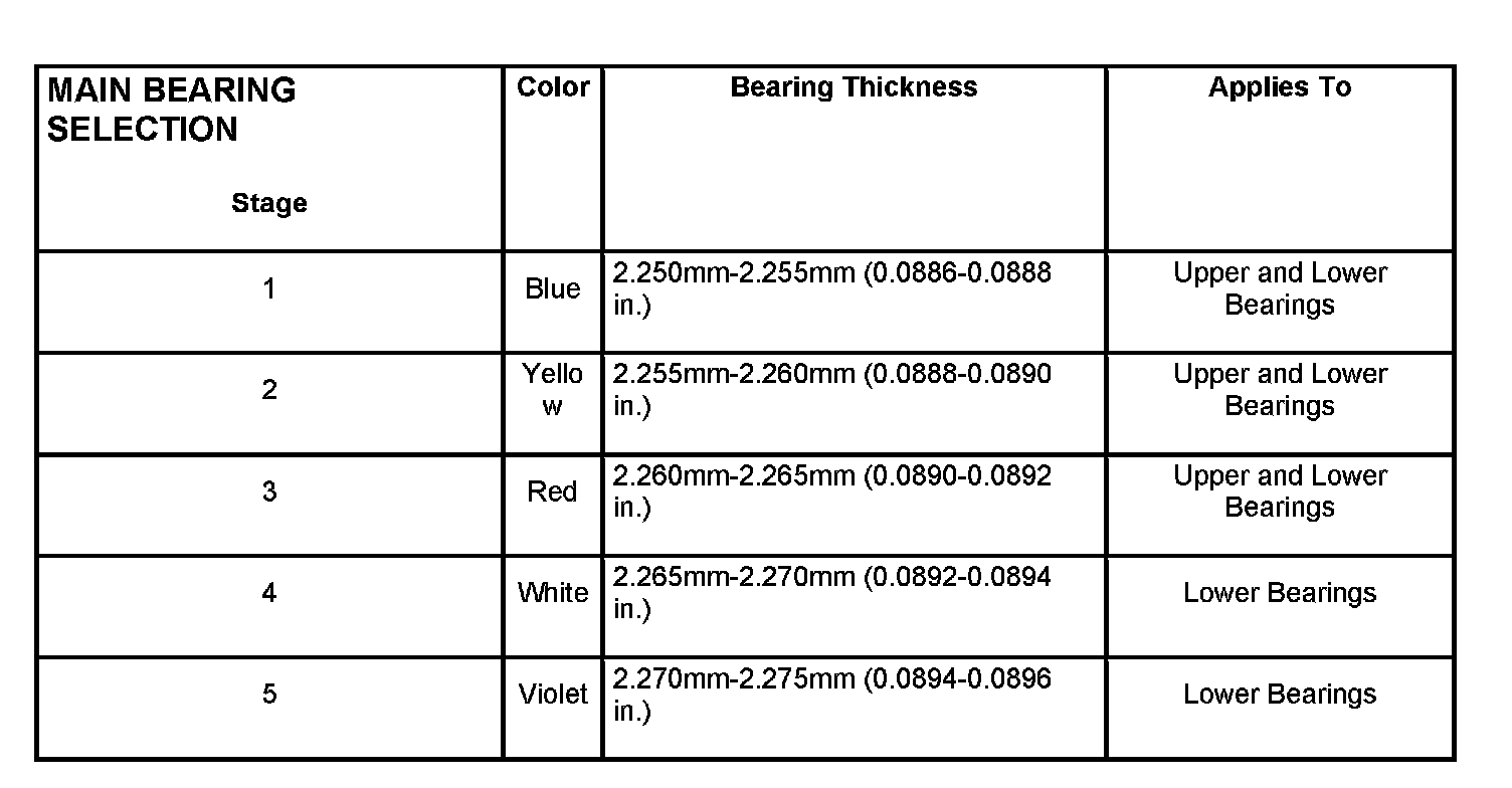 The upper main bearings are available in three different thicknesses and the lower bearings in five. A color coded mark on the side of the bearing is used to identify it's thickness. Each color coded bearing is matched to it's respective journal. The select fit is obtained by matching the color coded bearings to grade identification marks on the cylinder block and crankshaft. Letters marked on the cylinder block identify the color of each upper-half main bearing, while letters marked on the front end of the crankshaft indicate the color of each lower half main bearing.