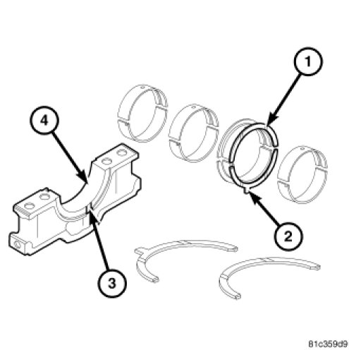 The No.3 main bearing cap includes provisions for the thrust washers. The thrust washers in the bearing cap have two locating tabs to prevent them from rotating and to avoid misassembly. During assembly, the oil grooves in the thrust washers must face the crankshaft thrust surfaces.
