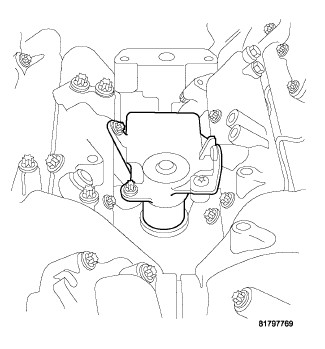 2. Tighten bolts to 16 Nm (142 in. lbs.), starting in the middle and tightening in a cross pattern outward until reaching the upper thermostat bolts on the right front manifold.
