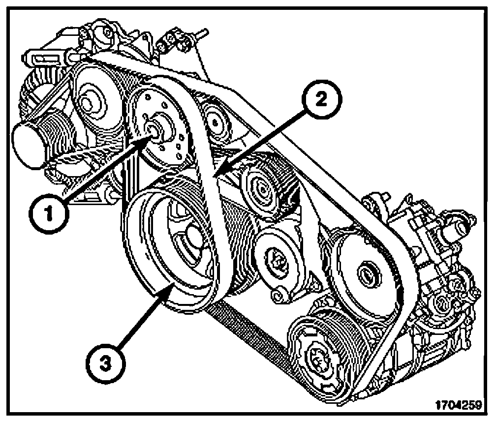 Note:The radiator fan assembly is attached (threaded) to the fan pulley (1). Remove the fan blade/viscous fan drive assembly from the fan pulley by turning the mounting nut clockwise as viewed from the front. Threads on the radiator cooling fan are REVERSE THREADED (LEFT-HAND THREAD).