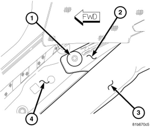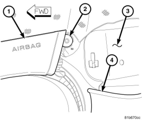 6. Remove the screw (1) that secures the curtain airbag (3) and garnish molding front bracket (2) to the inside of the upper A-pillar (4).