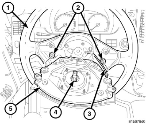 1. Position the driver airbag (5) close enough to the steering wheel (1) to reconnect the electrical connections on the back of the airbag housing.