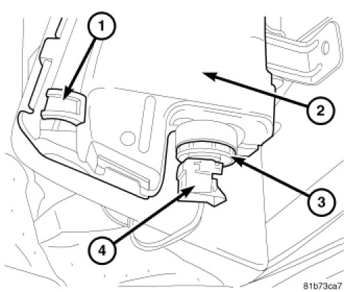 6. Pull the seat airbag unit away from the seat far enough to access and disconnect the seat wire harness connector (4) from the seat airbag inflator (3) connector receptacle. To disconnect the connector: