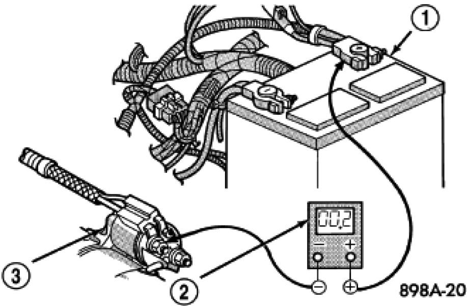 3. Connect the voltmeter (2) to measure between the battery positive cable terminal clamp (1) and the starter solenoid B(+) terminal stud (3). Rotate and hold the ignition switch in the Start position. Observe the voltmeter. If the reading is above 0.2 volt, clean and tighten the battery positive cable eyelet terminal connection at the starter solenoid B(+) terminal stud. Repeat the test. If the reading is still above 0.2 volt, replace the faulty battery positive cable.