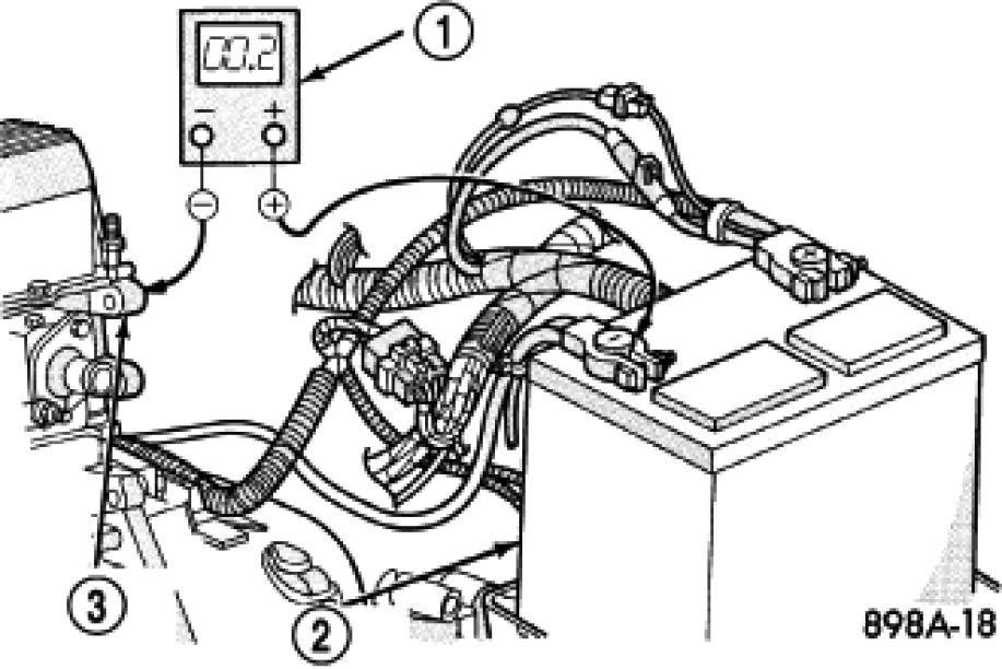 When performing the voltage drop test, it is important to remember that the voltage drop is giving an indication of the resistance between the two points at which the voltmeter probes are attached. EXAMPLE: When testing the resistance of the battery positive cable, touch the voltmeter leads to the battery positive cable terminal clamp and to the battery positive cable eyelet terminal at the starter solenoid B(+) terminal stud. If you probe the battery positive terminal post and the battery positive cable eyelet terminal at the starter solenoid B(+) terminal stud, you are reading the combined voltage drop in the battery positive cable terminal clamp-to-terminal post connection and the battery positive cable.
