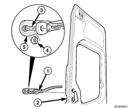 5. Close and snap the cover (5) over the rear wiper arm pivot end on the rear door (2).