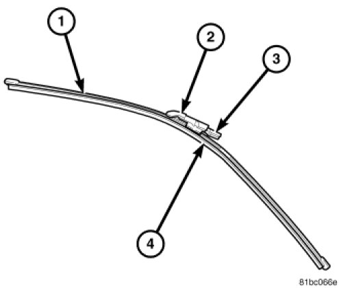 The rear wiper blades on this vehicle are a bracketless or beam-type design. Each rear wiper blade is secured by an integral latching pivot block to a bracket formation on the tip of each wiper arm, and rests near the base of the rear door glass when the wipers are not in operation. The wiper blade consists of the following components: