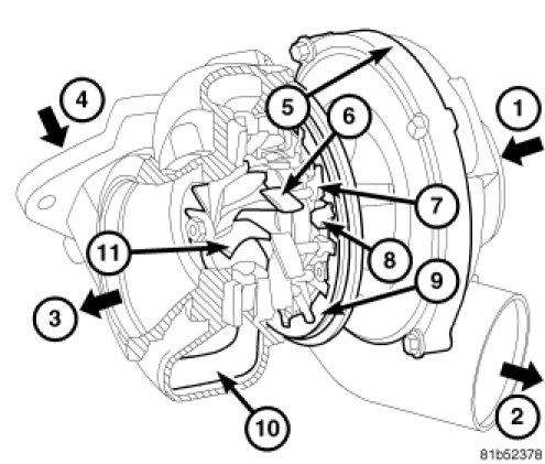 The turbocharger used on this vehicle is of the variable turbine type. These turbochargers use the entire exhaust energy to boost efficiency of the turbocharger and the engine.
