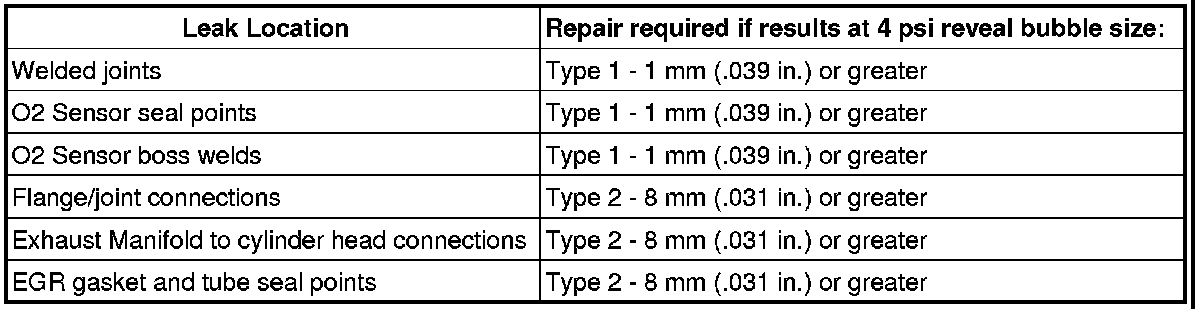 - Type 1 Leak is defined as a leak where very small foam like bubbles 1mm (.039 in.) or less appear. Any Type 1 or greater leaks found in welded joints, O2 sensor seal points or O2 sensor boss welds must be repaired or the component must be replaced.