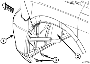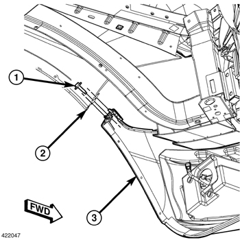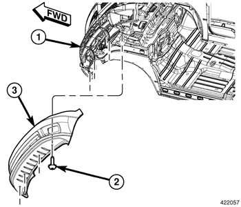 1. Remove the push pins (3) and position the wheelhouse splash shield (2) aside.