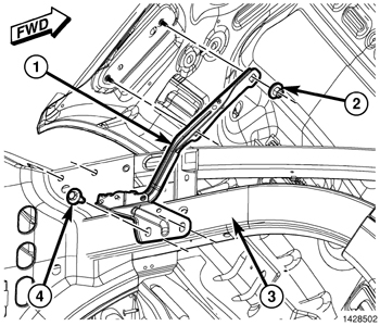 1. Position the hood onto the hood hinges (1) and loosely install the two nuts (2) that secure the hood to each hood hinge.