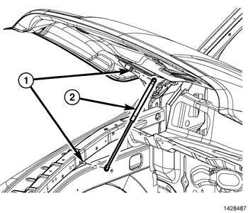 3. Support the hood and disconnect the gas prop (2) from the hood.
