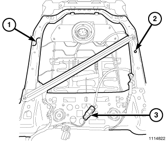 3. Disconnect the vented seat motor electrical connector (3) and remove the electrical harness pin-type retainer (2) from the seat frame (1).
