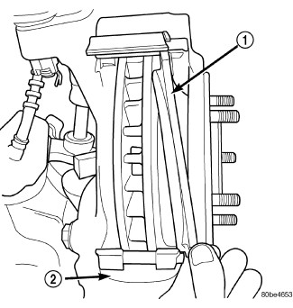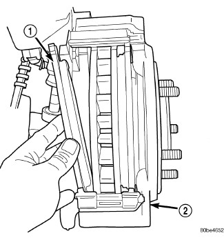 8. Remove the top anti-rattle spring (2) from the caliper adapter (1).