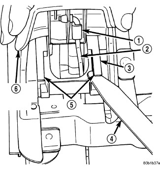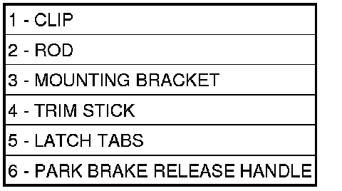 7. Using a trim stick (4) or another suitable wide flat-bladed tool, gently pry each of the park brake release handle (6) mounting bracket latch tabs (5) away from the retaining notches in the instrument panel receptacle (Figure 1).